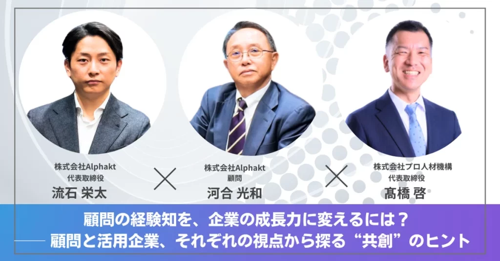 Alphaktさんは上手く外部人材の力を引き出している印象です。最近、多くの企業から「顧問を招いたのに活用しきれない」という相談が増えています。私たちは顧問活用の事例を沢山見てきているので、上手く活用できている会社の工夫を知りたいという相談をいただくのですが、貴社の工夫は非常に参考になると思っています。