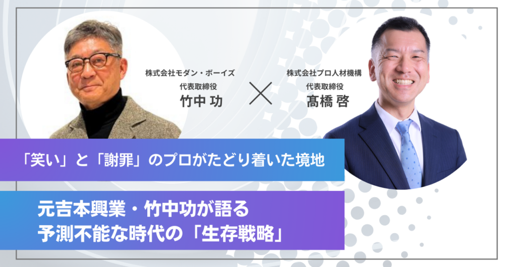 吉本興業で35年間にわたり宣伝広報の最前線に立ち、ダウンタウンらを輩出した養成所「NSC」の設立、月刊誌『マンスリーよしもと』の創刊、そして数々の謝罪会見を取り仕切ってきた竹中功さん。「謝罪マスター」の異名を持つ彼は現在、その類まれなコミュニケーション術を活かし、全国の刑務所で受刑者に向けた「社会復帰支援」の授業を行っています。