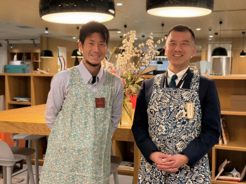 cotton松井のエプロンをつける二人。母の日のプレゼントにぜひ。