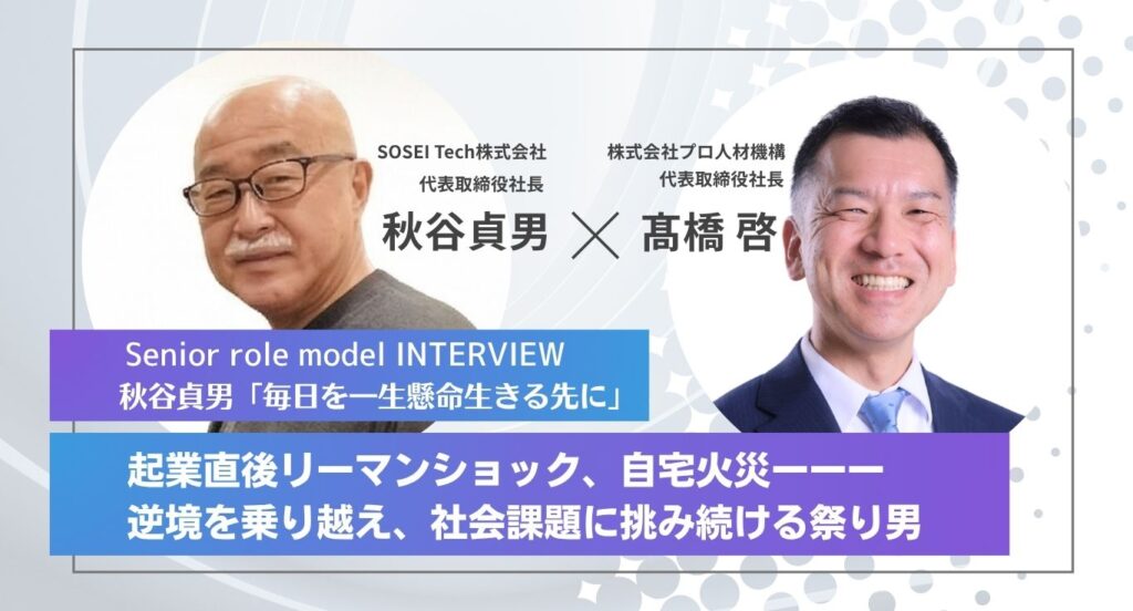 二度の自宅全焼やリーマンショックという壮絶な逆境をいかに突破し、新たな価値を創造し続けられるのか。プロ人材機構 代表 高橋啓が、秋谷氏の波乱万丈な半生から、これからの時代を生き抜くシニアの真髄に迫りました。